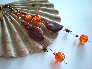 Kolczyki wykonane z przepięknych szklanych korali cracle, drobnych korali, szklanych listków, linki jubilerskiej oraz elementów posrebrzanych, bigle miedziane. Długość kolczyków około 8,5 cm.