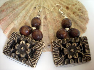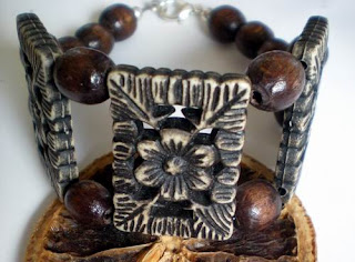 Komplet wykonany z korali drewnianych, elementów akrylowych oraz posrebrzanych. Długość kolczyków 5 cm., długość bransoletki 19,5 cm.