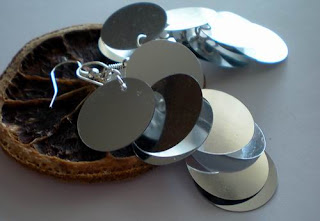 Kolczyki wykonane z cekinów oraz elementów posrebrzanych. Długość ok. 5,5 cm.