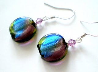 Kolczyki wykonane ze szkła weneckiego, kryształków bicone i elementów srebrnych.