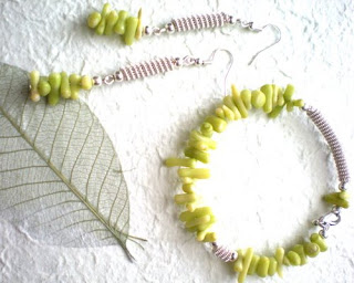 Komplet wykonany z korala zielonego i elementów posrebrzanych.