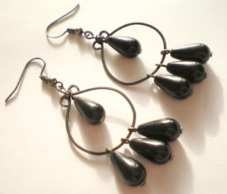 Ręcznie młotkowane podstawy koczyków, szklane krople. Całość oksydowana.