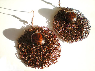 Kolczyki misternie wyplecione z drucika miedzianego, następnie młotkowane. W centrum umieszczona pastylka ze szkła weneckiego.