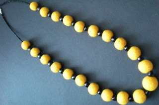 Długie korale wykonane z żółtych kul filcowych oraz koralików szklanych. Bransoletka z tych samych elementów, na gumce jubilerskiej, pasuje na każdy nadgarstek :)