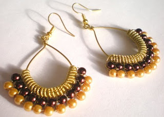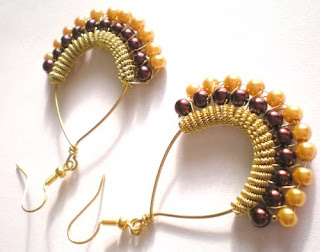 Bardzo pracochłonne kolczyki wykonane z drucika pozłacanego i szklanych pereł.