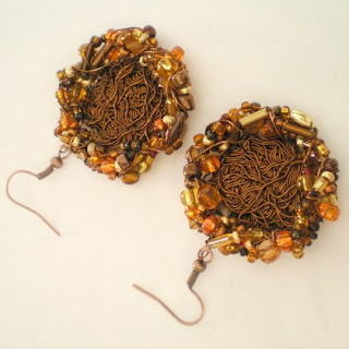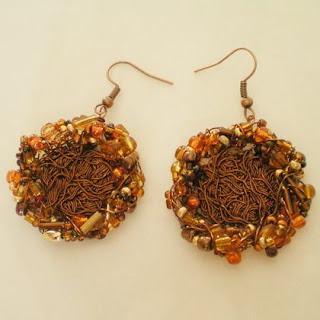 Kolczyki misternie wyplecione z drucika miedzianego, następnie młotkowane. Na zewnątrz dopleciono mnóstwo drobnych koralików.