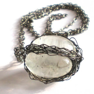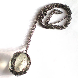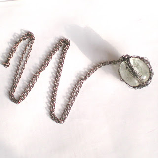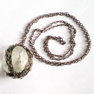 Przepiękny naszyjnik wykonany ze szkła oplecionego cieniutkim drucikiem, zawieszony na łańcuszku, całość mocno oksydowana.