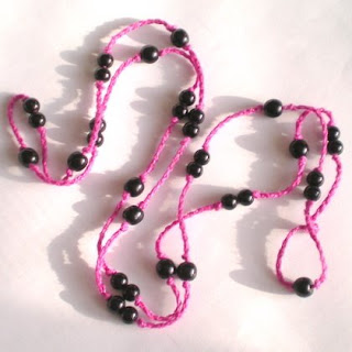 Efektowne korale wykonane z kordonka o pięknym amarantowym kolorze i czarnych szklanych korali. Długość ok. 95 cm.