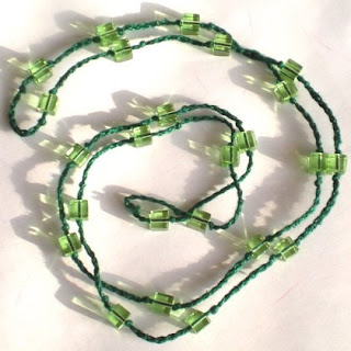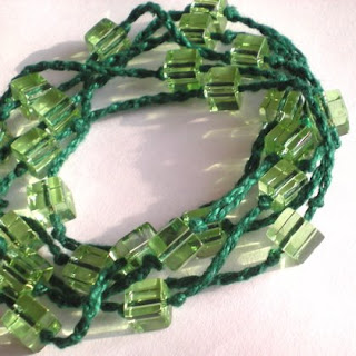 Efektowne korale wykonane z kordonka o pięknym zielonym kolorze i kostek szklanych k. Długość ok. 95 cm.