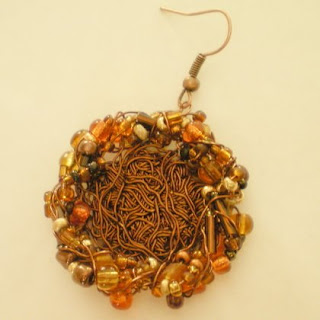 Kolczyki misternie wyplecione z drucika miedzianego, następnie młotkowane. Na zewnątrz dopleciono mnóstwo drobnych koralików.